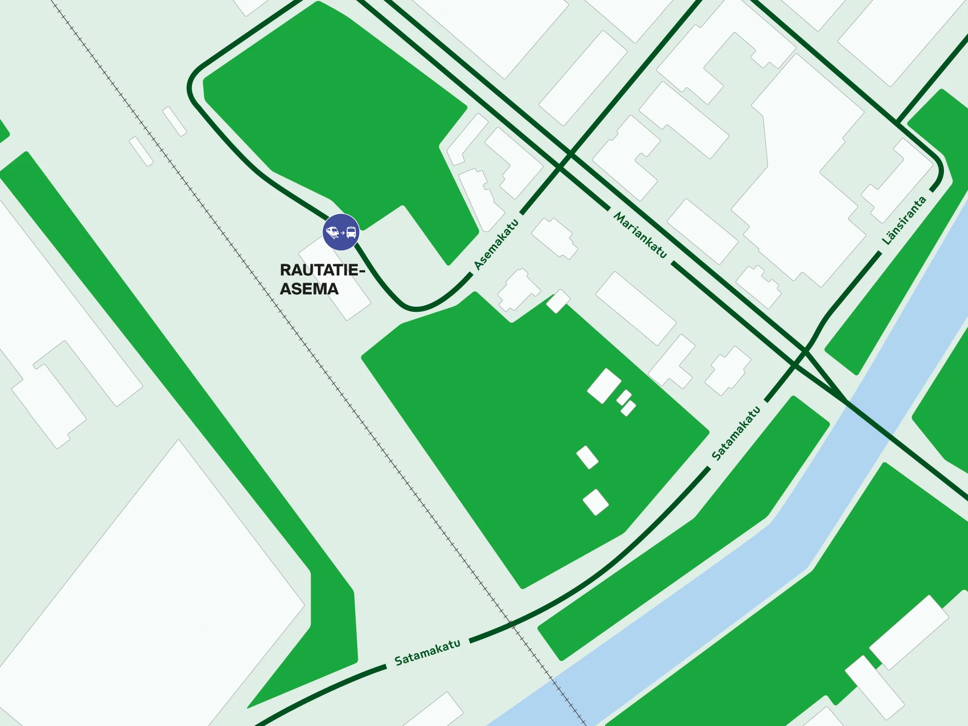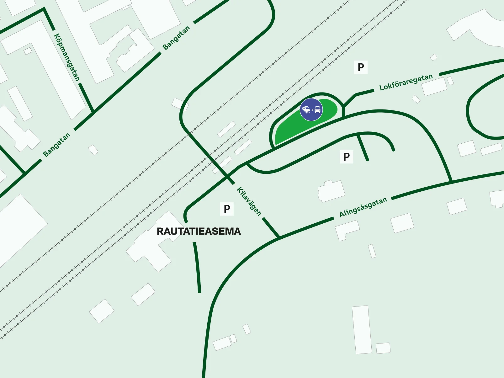Ratatyöbussit lähtevät raiteen 1 vierestä, asemarakennuksen länsipuolelta.