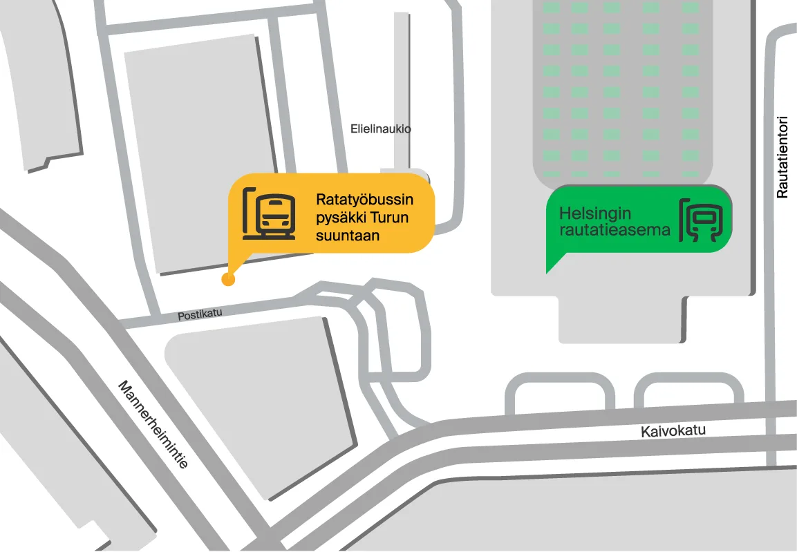 Helsingin päärautatieasemalla kaikki ratatyöbussit lähtevät Postikadulta, Postitalon puolella sijaitsevalta pysäkiltä.