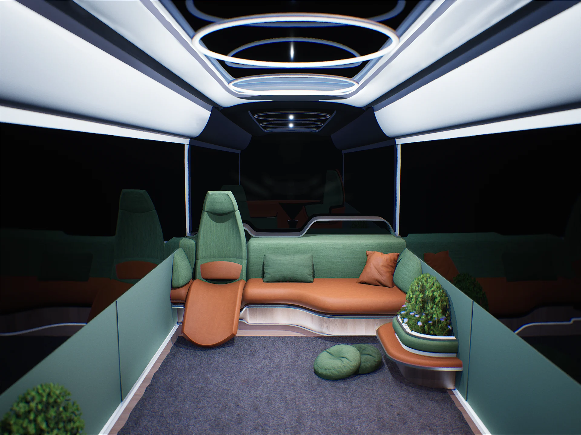 Podin sisäpuolella ikkunapinnat ovat kokonaan näyttöruutua, jonka ansioista podiin saa luotua haluamansa tunnelman. Vili heijastaa näytöille työhön liittyvää aineistoa ja valmistautuu matkakohteessa odottavaan tapaamiseen. Virtuaaliassistentti kirjaa ylös Vilin havainnot ja ääneen puhutut ajatukset sekä auttaa ongelmanratkaisussa. Matkan loppupuolella Vili tilaa ravintolavaunussa lähituotantona kasvatetuista aineksista valmistettua vegaaniruokaa.