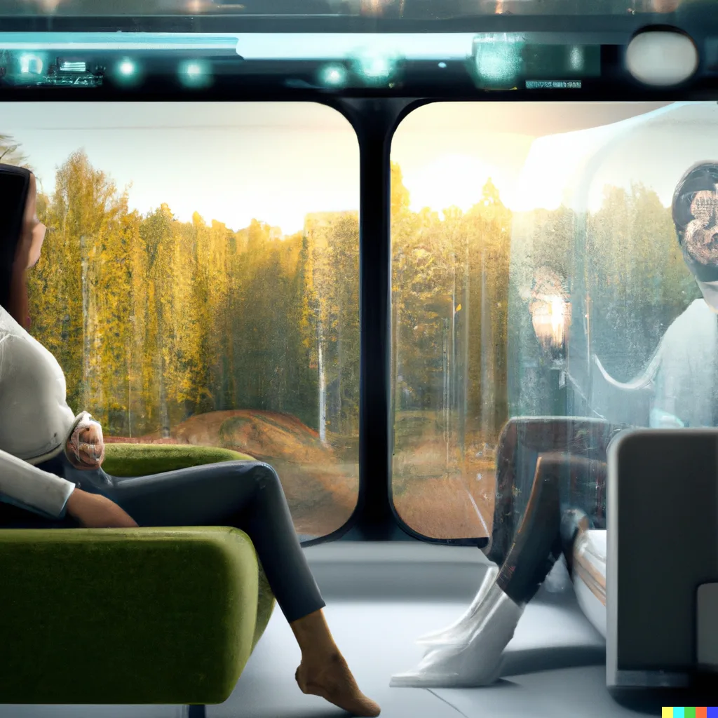 Haimme vuodelle 2072 visuaalista inspiraatiota myös tekoälyltä – tulevaisuuden junien kuvitelmia ulko- ja sisäpuolelta DALL-E:n (mini & beta) luomana. Tekoälyn luomia kuvia hyödynnettiin inspiraatiokuvituksena kumppanimme ZOANin kanssa, kun he työstivät meille tulevaisuudenkuvaamme pohjautuvan, visualisoidun ja pelimoottorilla mallinnetun vision tulevaisuuden liikkumisesta videon muodossa. Videon avulla pääset matkalle vuoteen 2072.